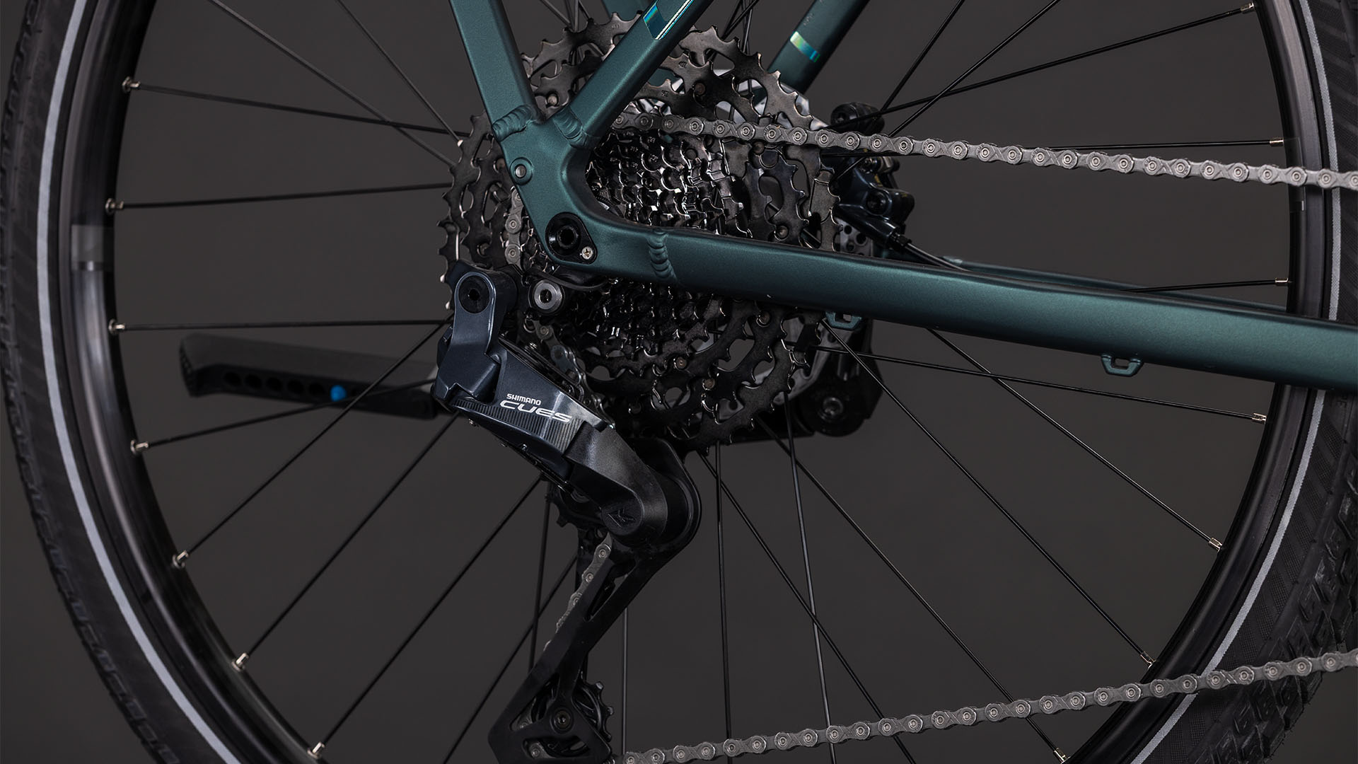 En cuanto a su sistema de cambios, la Cube Kathmandu SLT duskwood´n´goblin cuenta con un desviador trasero Shimano Cues Q`Auto Di2 de 11 velocidades, que garantiza cambios precisos y fluidos en cada pedaleo. Además, sus frenos Shimano Cues BR-U8000/BR-U8010 Flat Mount te brindan una potente y segura capacidad de frenado, para que puedas detenerte con confianza en cualquier situación.