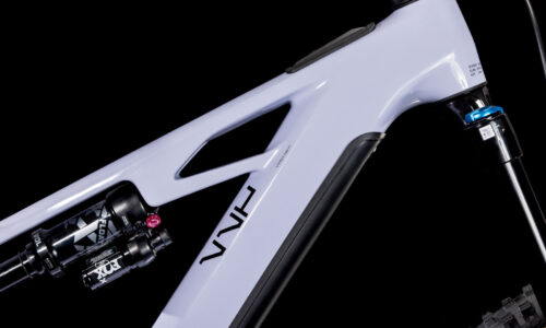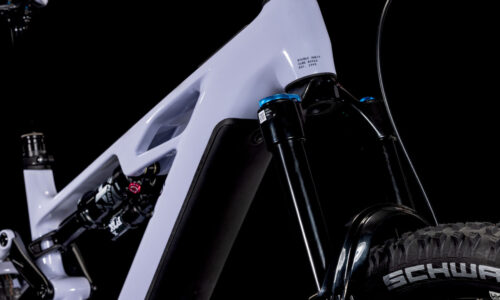 El cuadro de la Stereo Hybrid ONE77 HPC, con recorrido de 170 mm delantero y trasero, y una configuración de ruedas mullet con 29 pulgadas delante y 27,5 pulgadas detrás es todo lo que necesitas para grandes días en grandes pistas de montaña. Aunque, igual que en todos los diseños de CUBE, la clave está en los detalles. Por ejemplo, hemos colocado los cables internamente para crear una estética muy orgánica y reducir el mantenimiento, y luego hemos añadido una dirección de ángulo ajustable para que configures el manejo a tu gusto. La batería PowerTube de 800 Wh está alojada discretamente en el tubo diagonal de carbono, justo encima de la transmisión Bosch CX. La puntera UDH del triángulo trasero de aluminio es resistente y está preparada para modificaciones futuras, y además hemos incluido un protector de cadena direct-mount para que sigas avanzando incluso cuando las cosas se ponen difíciles.